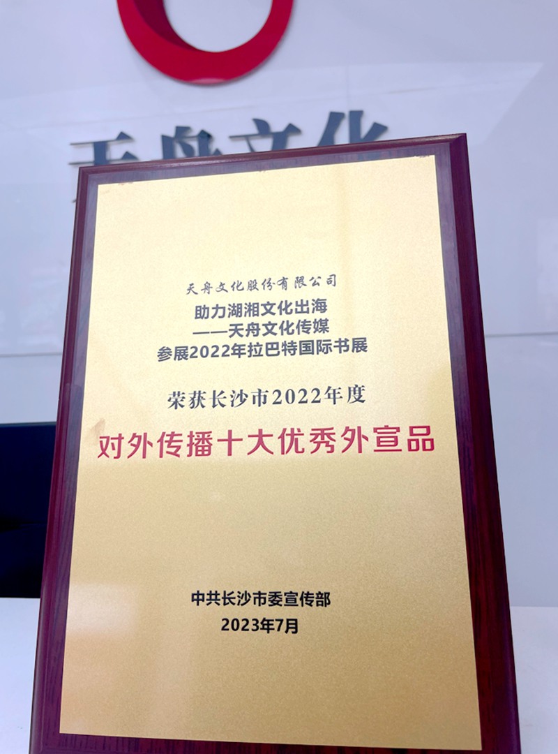 会上,2022年长沙市十大对外传播优秀案例、外宣品、外宣图片获奖作品受到表彰。多盈地址报送的“助力湖湘文化出海——天舟文化参展2022年拉巴特国际书展”作品荣获“2022年度长沙市优秀文化外宣品”。